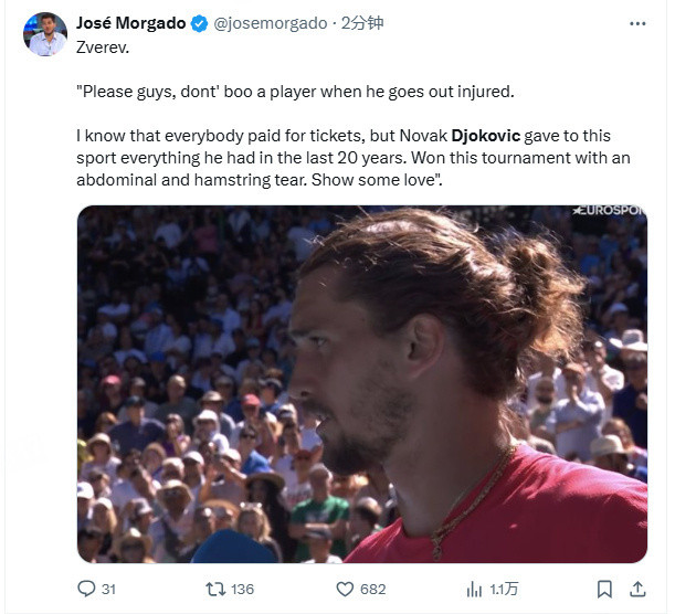 晋级后,现役世界排名第2的兹维列夫采访也为德约鸣不平:“希望大家不要嘘一个受伤的球员,我知道大家买了票,但德约过去20年为这项运动付出了一切,请给他一些关爱吧。”考虑到德约科维奇已经37岁,未来他要想再次问鼎澳网男单冠军,或许真的很难了。